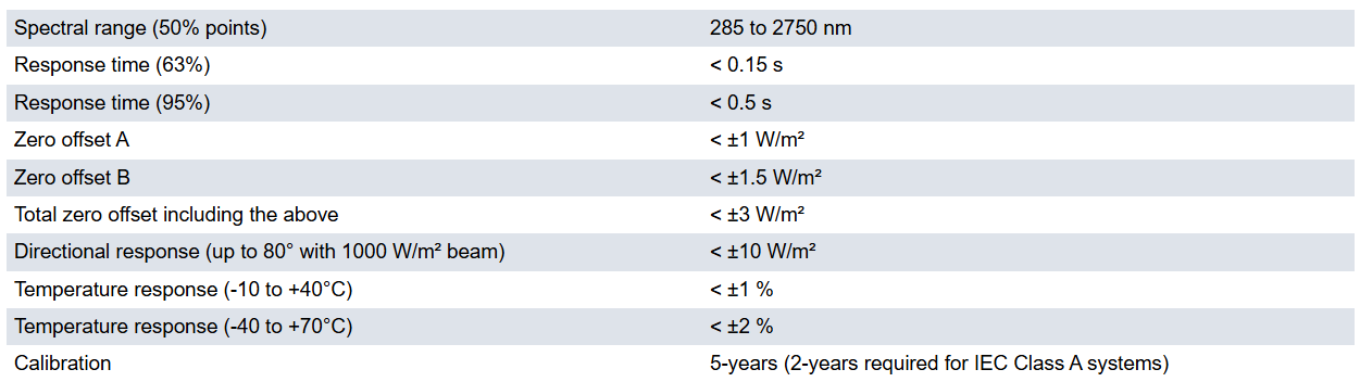 - ISO 9060 spectrally flat fast response Class A and IEC 61724-1 Class A monitoring