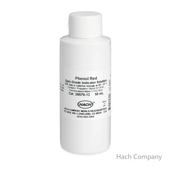 100 mL 註有刻度滴管瓶中的酚紅指示劑溶液提供簡單容易使用的比色法測定 水中pH 值。隨著樣品鹼度增強,溶液顏色由黃色變為紅色,進而提供一個使用比色計測量 pH 值的簡單可靠的方法。